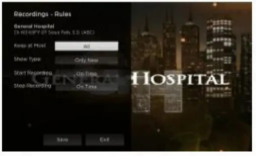 Use the Rules feature to manage the episodes of a series that you want recorded automatically. From the Recordings screen, press the Down arrow of your remote control, highlight Rules, and press OK to see a list of your series programs. Scroll through the list and highlight a series that you want to manage, press OK on your remote to open a series, at this point a Recordings – Rules screen will open. Highlight the option next to Keep at Most and press OK on your remote to scroll and choose a maximum number of episodes that you want to keep of this series, or you can choose to keep All Episodes, press OK to make your selection.