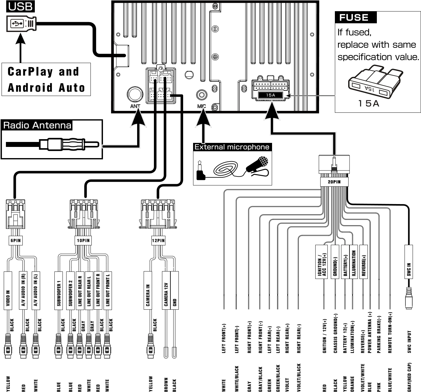 Connect an optional rear camera to the Camera Input (Black RCA connector). Refer to the wiring diagram for details.