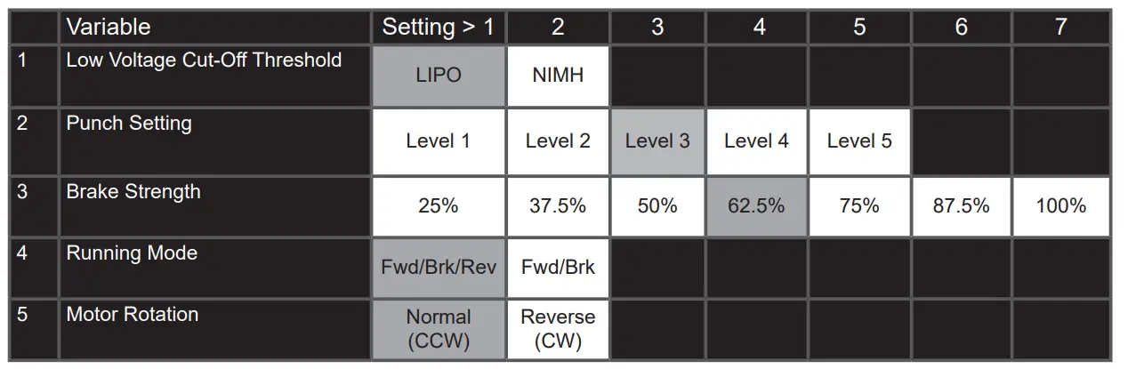 The ARRMA BLX brushless ESC is setup for use straight from the factory, if you want to alter the settings for your track or driving style please see the table and steps below: