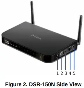 To power on the DSR-150N device, please push down the power button on the side of the device. To power off the device, please push down the power button again, and the power button will recover the non-pressed position.