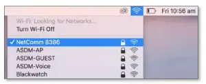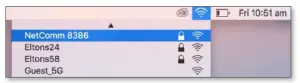 Note – If you cannot see an Airport icon, your wireless adapter may not be installed or inserted correctly. Please refer to your Mac user guide before continuing with the steps in this guide. - A list of Wi-Fi networks including your WiFi network name/SSID is displayed (in this example, it is “NetComm 8386”). Click your WiFi network name/SSID to connect to this network.