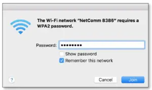 The configuration in the modem is now complete. Use computer/laptop, mobile or iPad to scan Wi-Fi network name, select the right Wi-Fi network name/ SSID (Example: NetComm 8386) and enter the displayed Wi-Fi password to join the network.
