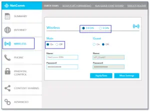 - The Wireless Name on this example is “NetComm 8386”. You may change the Wireless Name and/or Password and press the “Apply/Save” button.