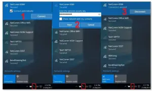 - Click the wireless symbol in the bottom right corner of the device. A list of detected networks within range of your computer is displayed. Select your WiFi network name (In this example, it is “NetComm 8386”) and click Connect.