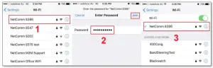 When Wi-Fi is turned on, your phone scans for available nearby networks. Tap your WiFi network name/SSID [1] (in this example, it is “NetComm 8386”), enter the WiFi password [2] and press Join [2].