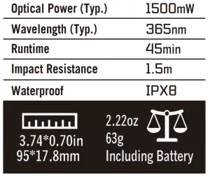 - The 365nm ultraviolet light can only reach the dermis, and can NOT penetrate any clothing.