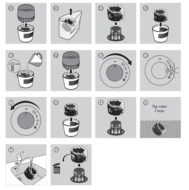 - Put the filter and the filter support back into the water tank (fig e).