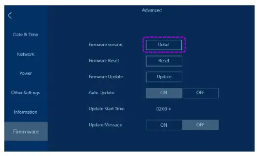 Touch “Detail” on “Advanced” – “Firmware” – “Firmware version” of OSD. Confirm the updated firmware version.