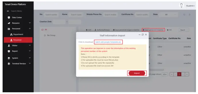 Step 2: Click “Input personnel in batches – batch add people templates.xls”, download “Templates”, enter personnel information in the template according the picture, then save the template, click “Import”, and import the saved personnel information template.