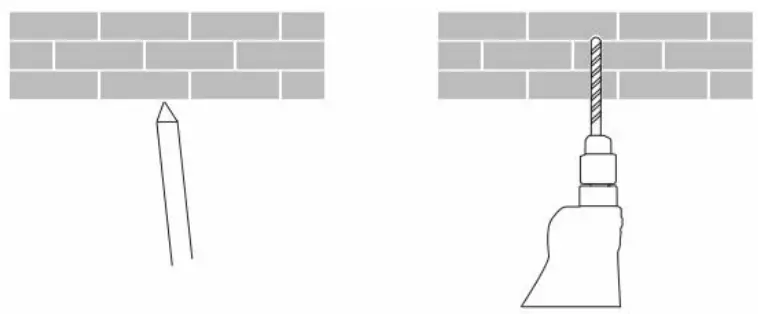 - First use a pencil to mark the positions for the base mounting holes on the wall, then drill two holes at the marked positions. The diameter of each hole is approximately 6 mm, and the depth is approximately 30 mm.