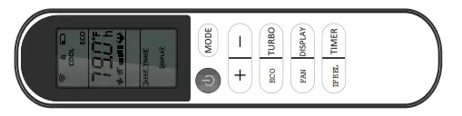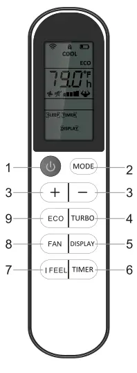 Note: The HEAT mode is only for some heating models. If you do not need it, press the MODE button for more than 5 seconds to delete the HEAT function, and the COOL mode will be selected automatically. Press the MODE again for more than 5 seconds to add the HEAT function, and the HEAT mode will be selected automatically - + and – : Use these buttons to increase ordecrease the Set Temperature or Timer.
