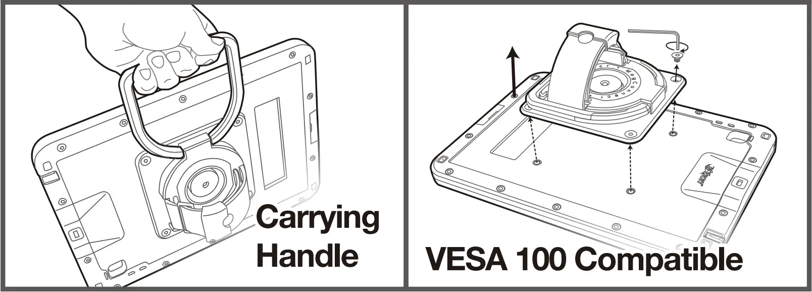 - Rotating, multi-angle and anti-slip kickstand and carrying handle