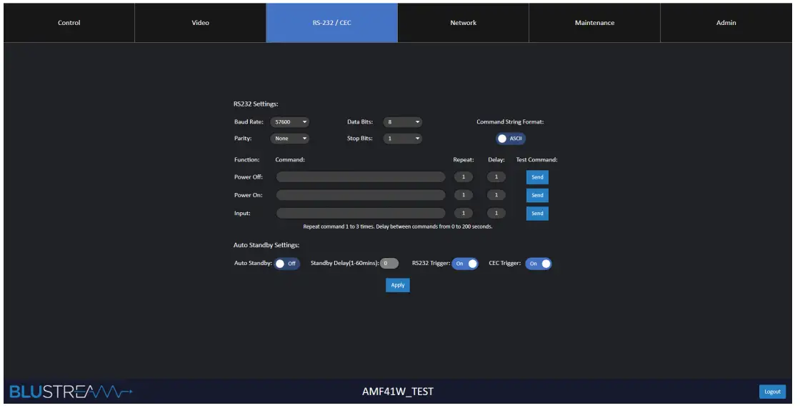 - Power Off Function – Specify an RS-232 command to be sent out of the RS-232 device when the AMF41W is powered off.