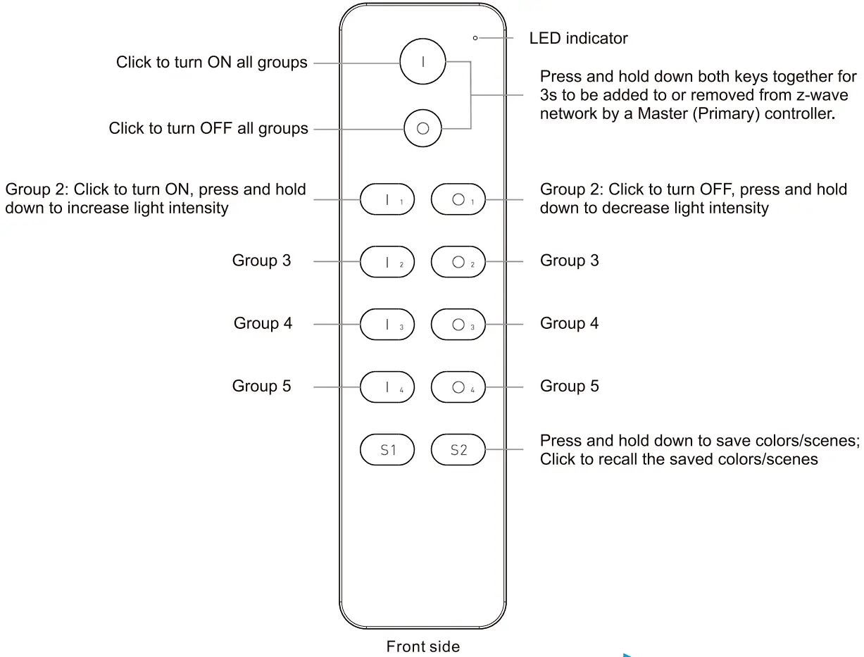 - Press and hold down | 2 / O 2 button, send light intensity increase/decrease command to all associated devices of Association Group 3.