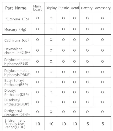 Indicates that this hazardous substance contained in all homogenous materials of this part is below the limit requirements GB/T 26572-2011 Use period is valid only when the product is operated under the condition defined in the product manual.