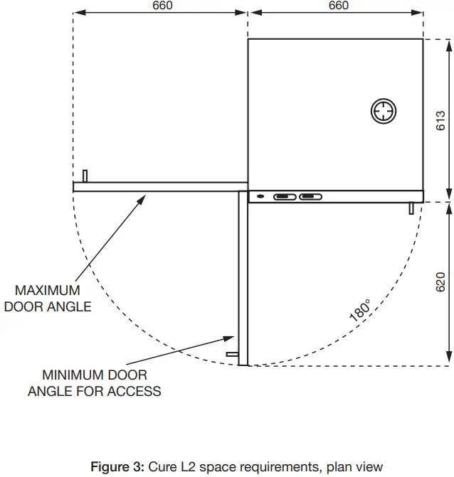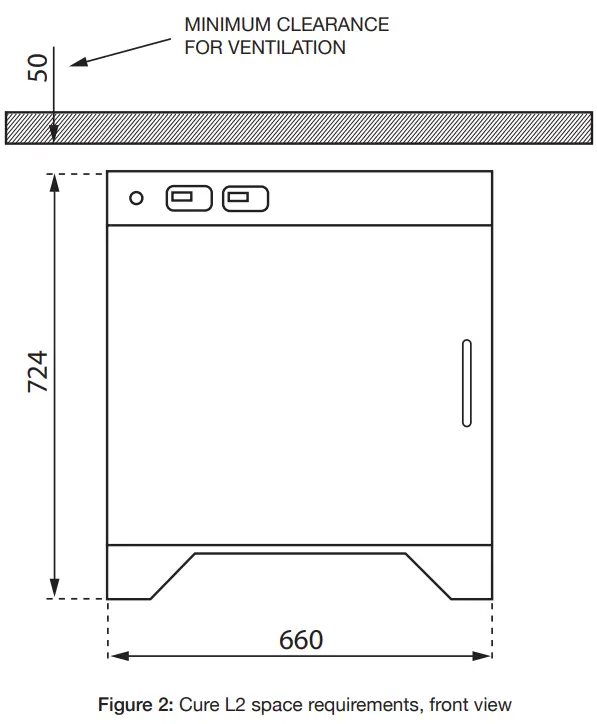 When choosing a suitable location for your Photocentric Cure L2, allow plenty of space (see Figure 2 and Figure 3). All diagrams have dimensions in millimetres unless otherwise stated. Considerthe ergonomics of operating the cure unit.