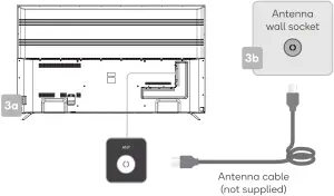 a. Connect an antenna cable (not supplied) via the ‘ANT’ input port at the back of the TV.