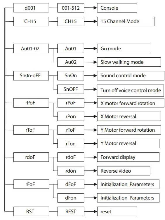 | 14 | 0-255 | 0-4 Turn off the light belt 5-109 Lamp band color selection 110-255 Lamp belt self-walking |