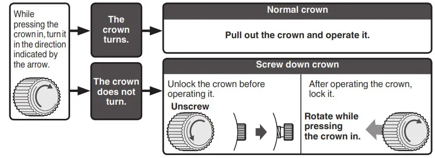* For models with screw-down crown, please unlock the crown before operating it.