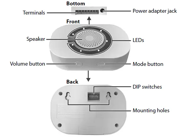 The Dakota Alert RE-4k Plus is a wireless security equipment that can be used to receive signals from the Dakota Alert 4000 series transmitters. It comes with a power adapter jack, LEDs, Mode button, DIP switches, mounting holes, and a speaker.
