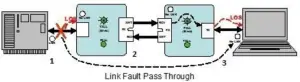 Link Fault Pass-Through (LFPT) is a troubleshooting feature that combines TX and FX Link Loss from both the local and remote Mini Mc, TX-FX/SFP modules. LFPT is enabled by turning on the DSW on both modules. This feature allows either end of the conversion to detect a link fault occurring at the other end of the media conversion chain.