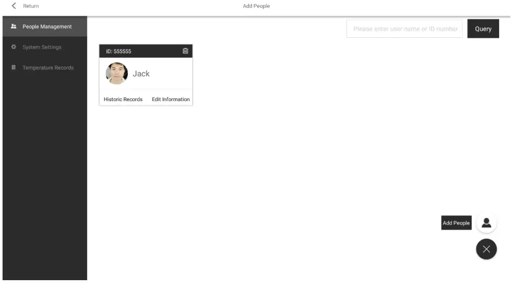 - Face information and body temperature information can be displayed in real-time statistics on the right side column