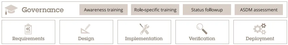 The SSG is responsible for governing the ASDM and evolving the toolbox over time. There is an ASDM roadmap and a rollout plan for implementing new activities and increasing ASDM maturity across the development organization. Both the roadmap and rollout plan are owned by the SSG, but the responsibility for actual implementation in practice (i.e., performing activities related to development phases) is delegated to the R&D teams.