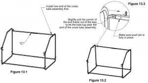 STEP 6: Attach one end of Cross tube assembly “C” at the right or left side of the frame, see figure 14.3. Then locate Bottom door assembly “D” and snap together, making sure that both tube lugs are facing the same direction, refer to Figures 15.2 & 15.3 at the bottom of the page. Once tube is snapped together place end over the wire closest to the frame, the wire without a rubber coating, figure 14.3. Once both tubes are in place on one end, swing the tubes up and slide into place on the other side. Pull the end frame away slightly so the tubes will clear the wire and tube lug, see figure 14.4. Slide the door frame end over the wire first, then place the cross tube assembly over the lug second. Once tube lug is fully inserted into the tube make sure it is pinned into place.