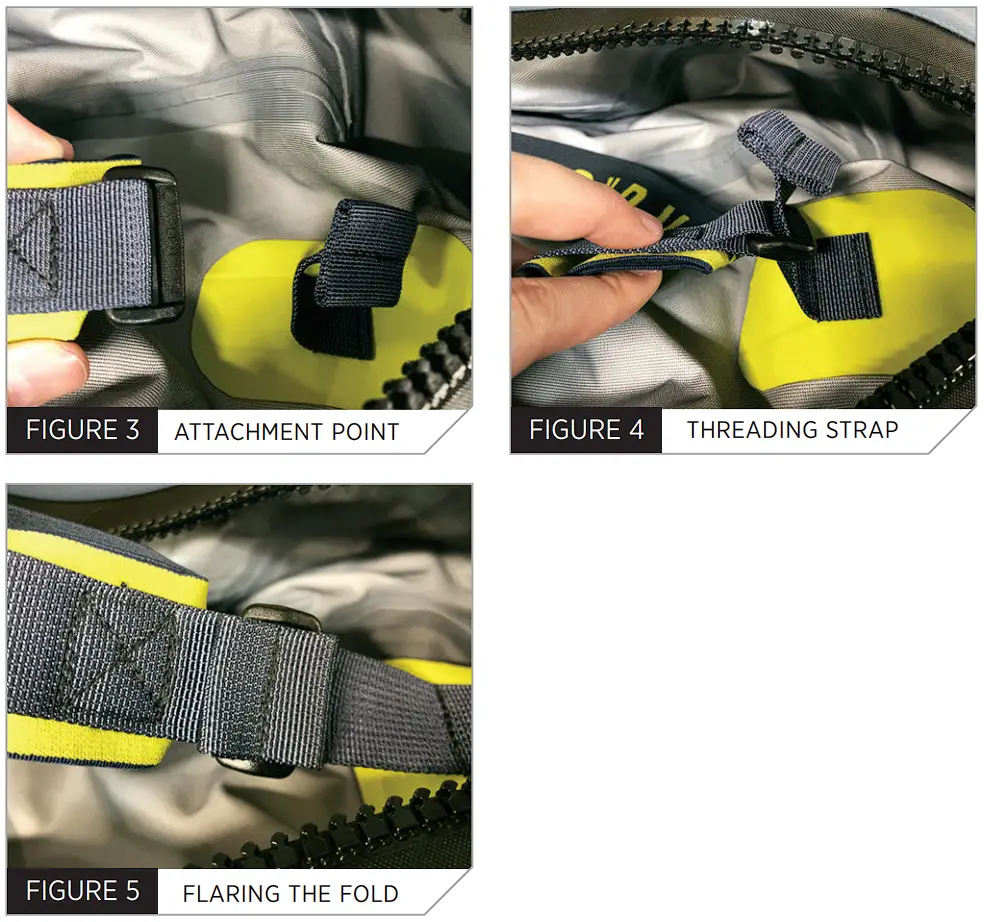 CAUTION: ALWAYS DON THE DRY SUIT ON A CLEAN SURFACE SUCH AS A TOWEL OR TARP TO AVOID ATTRACTING DEBRIS. PEBBLES, SAND, DIRT AND OTHER DEBRIS ON THE GROUND CAN CAUSE DAMAGE TO DRY SUIT SOCK AND COMPROMISE THE SUIT’S INTEGRITY.