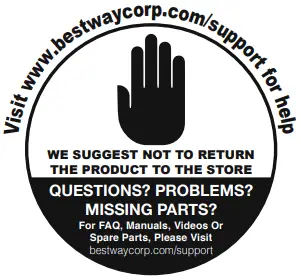 To check the parts included in the box, consult the part list inside this manual. Verify that the equipment components represent the model that you had intended to purchase. In case of any damaged or missing parts at the time of purchase, visit our website bestwaycorp.com/support.