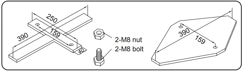 EN60335-2-41 TEST standard requires the filter pump to be vertically fixed on the ground or a base made of wood or concrete before use. There should be two holes 9 mm in diameter on the base, the space between which should be 159 mm. Put filter pump on the base and attach them together by fastening the bolts and nuts. All the base parts should weigh at least over 18 kg to prevent the pump from accidentally falling.