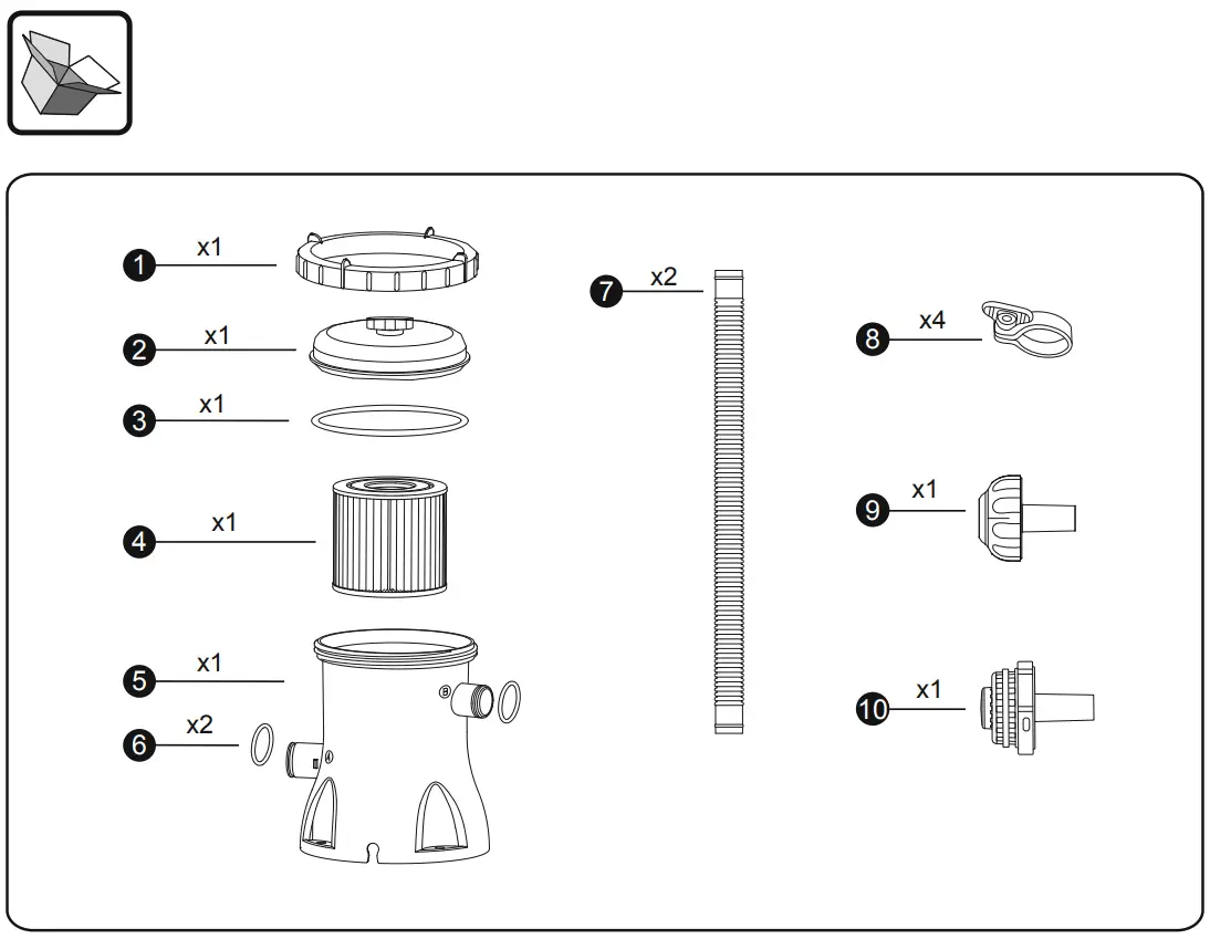 - Please examine equipment before use. Notify Bestway at the customer service address listed on this manual for any manufacturing defect or missing parts at the time of purchase. Verify that the equipment components represent the filter pump model that you had intended to purchase.