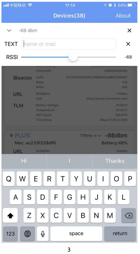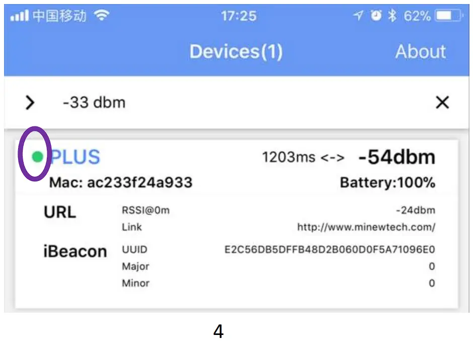 - For example: Slide the RSSI slide bar to set the RSSI value at -33 dBm as the filter, then see image 4; there is only one beacon and its MAC address is ac233f24a933 which we want to configure it.