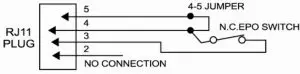 The feature is used with EPO controllers. Use the provided gray cable to connect to an EPO contact switch. Follow the appropriate circuit diagram below to wire the cable to match your EPO configuration. EPO function is provided in the UPS. EPO remote switch which is a Push-Back button installed computer room outside by a EPO cable, and not connected any other equipment.