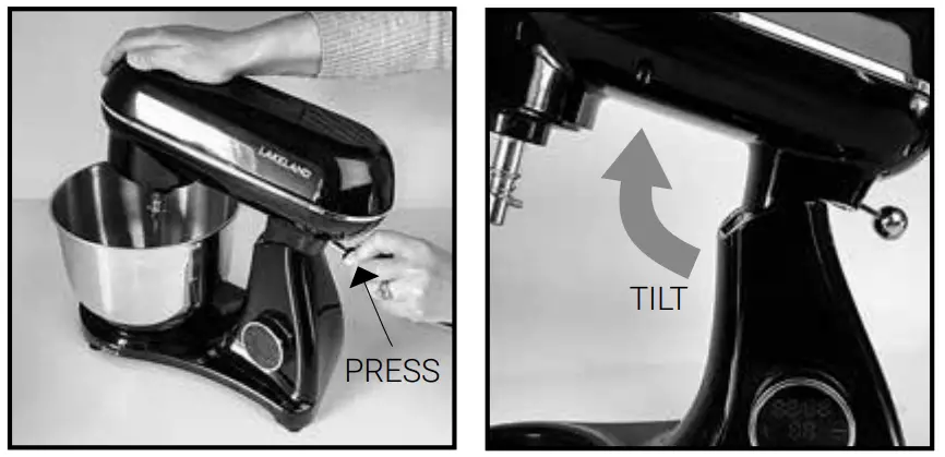 When adding or removing the bowl, splatter guard or attachments the arm must always be raised. Press the ‘TILT’ lever to raise the arm.