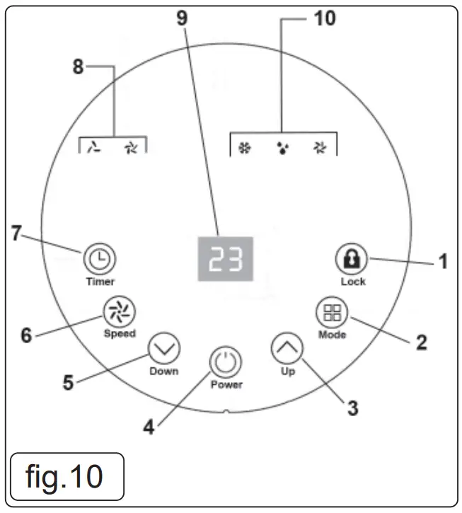 NOTE: In ventilation mode the room air is circulated NOT cooled. - Press the Speed button (fi g.10 #6) Until the desired fan speed indicator illuminates (fi g.10 #10).
