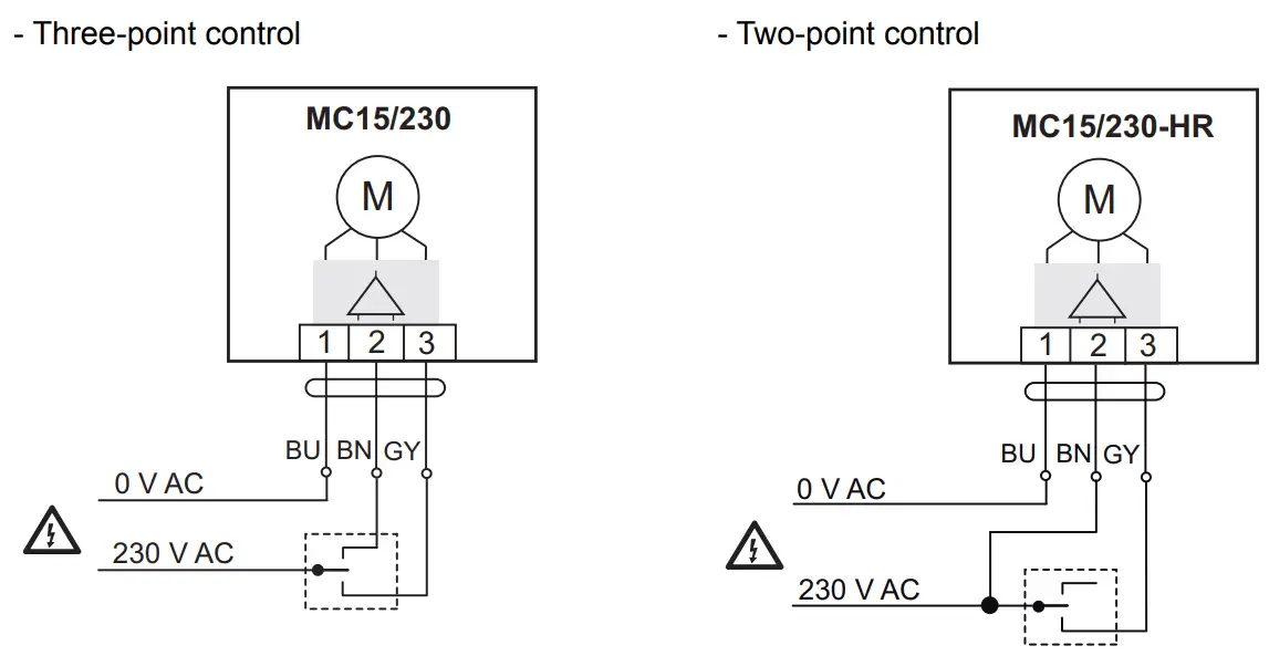![]() | CAUTION Do not operate the MC15/230 Small Actuator electrically without a valve |
