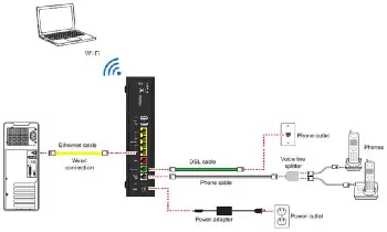 The following diagram illustrates BGW210-700 Broadband Gateway connections to the Internet using DSL Broadband. Phone and power adapter connections are also illustrated.