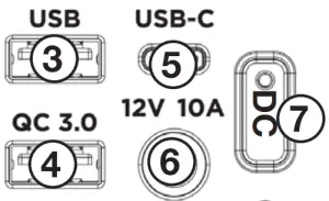 - USB-A QC (Quick Charge) 3.0, 5/9/12VDC, up to 3.0A, 18W Max