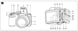 1 Zoom Lever 16 Fast Video Recording Button 2 Shutter Button 17 Menu Button 3 Strap Eyelet 18 Micro USB Port 4 Exposure Compensation Button 19 Micro HDMI Port 5 Continuous Shot Button 20 AF Button/Up Button 6 Power Switch 21 Flash Button/Right Button 7 AF Assist Beam/Self-Timer Lamp 22 Delete Button/Self-Timer Button/Down Button 8 Mode Dial 23 Display Button 9 Flash Lamp 24 Battery Cover Buckle 10 Flash Button 25 Battery Cover 11 Microphone 26 Playback Button 12 Speaker 27 Tripod Socket 13 Lens 28 Macro Button/Left Button 14 “i” Button 29 SET Button 15 Indicator Lamp 30 LCD - Inserting the Batteries and the Memory Card.