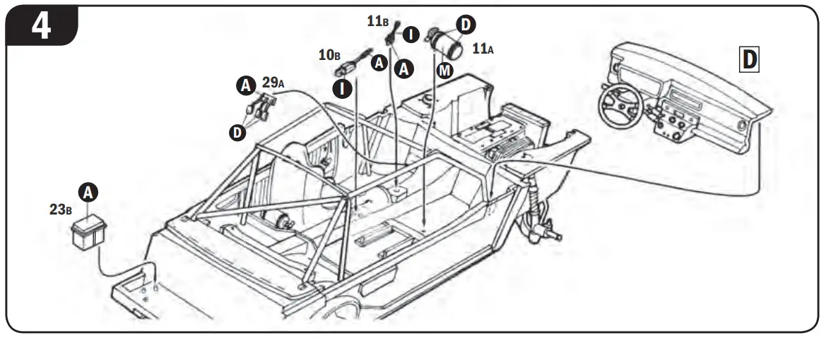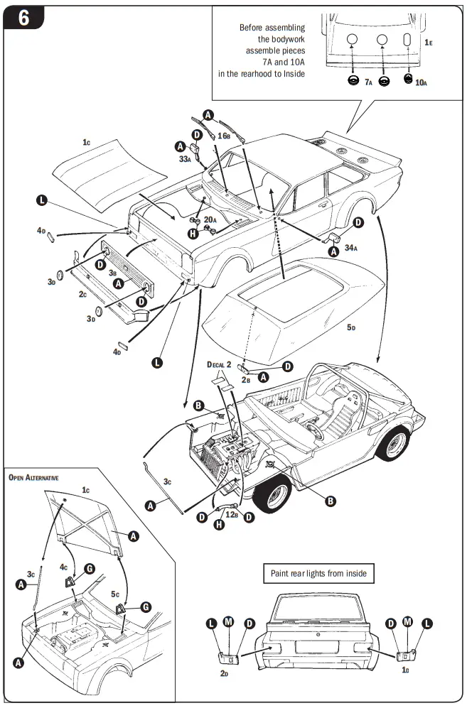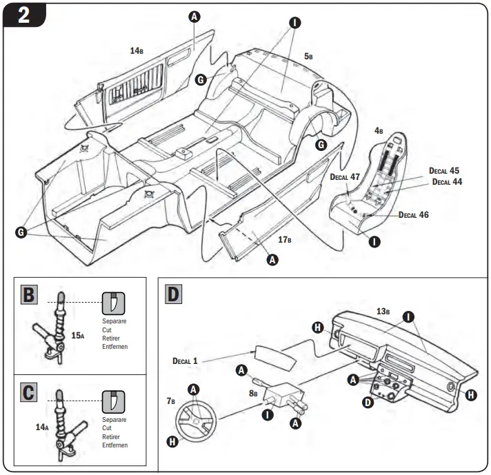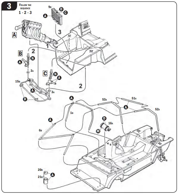 Do not pull ol parts. Assemble the parts in numerical sequence. Use plastlc cement ONLY and use cement sparingly to avoid damaging the model. Black arrows indicate parts to be glued together. White arrows indicate on which frame the parts must be assembled WITHOUT using cement. These letters (A – B – C…) indicate on which frame the parts will be found. Paint small parts before detaching them from frame.