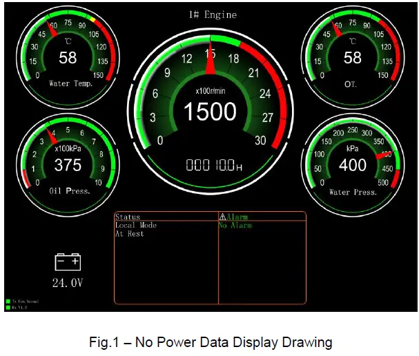 c)Alarm: if no alarms occur, icon shows as white color; if warning alarms occur, both icon and alarm information display as yellow color; if shutdown alarms occur, both icon and alarm information display as red color.