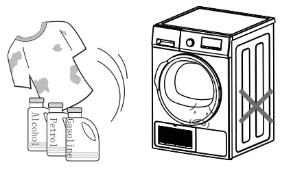 - Don’t put combustible liquid such as gasoline, petrol, and alcohol into the appliance or nearby. Don’t put clothes with that liquid into the appliance.
