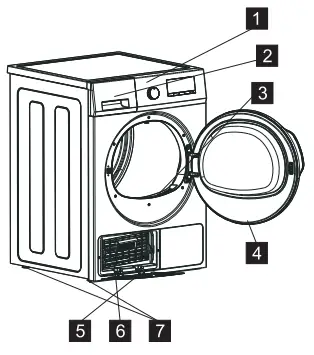| 1. Control Panel 2. Drainage container 3. Fluff filter 4. Door | 5. Condenser cover 6. Condenser 7. Adjustment leg |