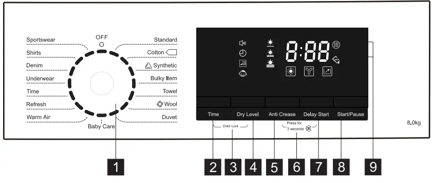 | 1. Programme Selection Knob 2. Time 3. Child Lock 4. Dry Level | 5. Anti Crease 6. Buzzer 7. Delay Start 8. Start/Pause 9. Indicator Lights: Drainage Container Fluff Filter |