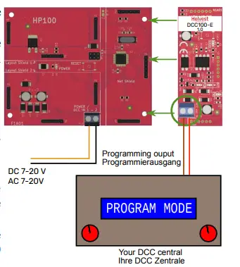 - – Connect the programming port of your central to the terminal of the DCC100-E. Connect the HP100 to the power