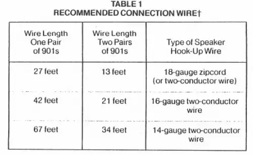 If the wire used to connect the speakers to your power am• amplifier has too much resistance, the audible coloration of the sound, and loss of power can result. The table below summarÂizes maximum wire lengths for 18-, 16-, and 14-gauge, twoÂconductor, stranded copper wire for use with one or two pairs of BOSE 901 loudspeakers.