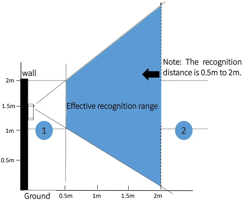 The figure below shows the effective recognition range of the terminal. People should stand within the effective recognition range; otherwise, face collection or recognition may fail.