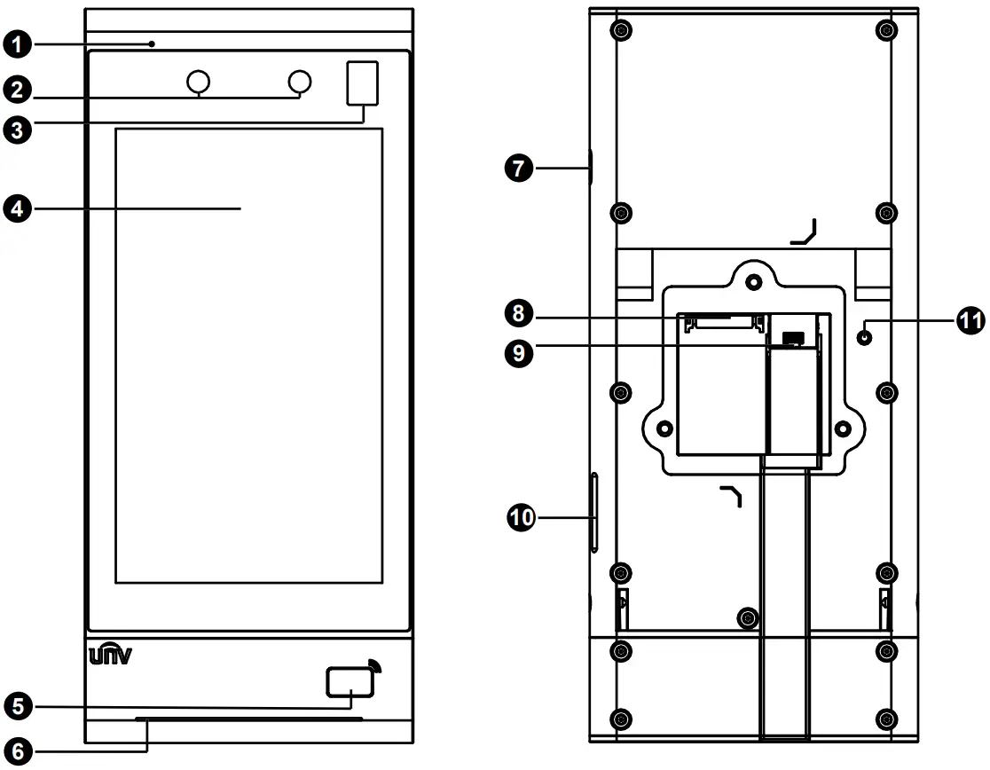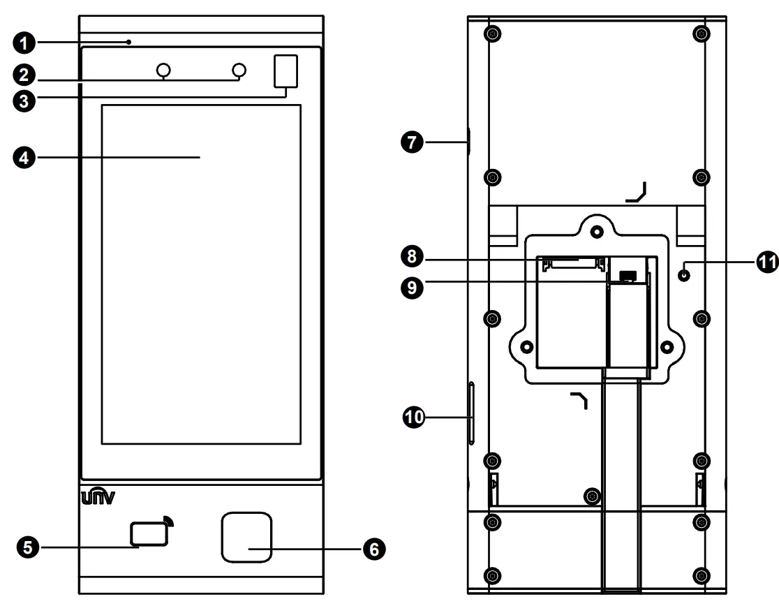 1.Microphone 2.Camera 3.Illuminator 4.Display screen 5.Card reading area 6.QR code reading area 7.Reboot button 8.Cable interface 9.Network interface 10.Loudspeaker 11.Tamper proof button