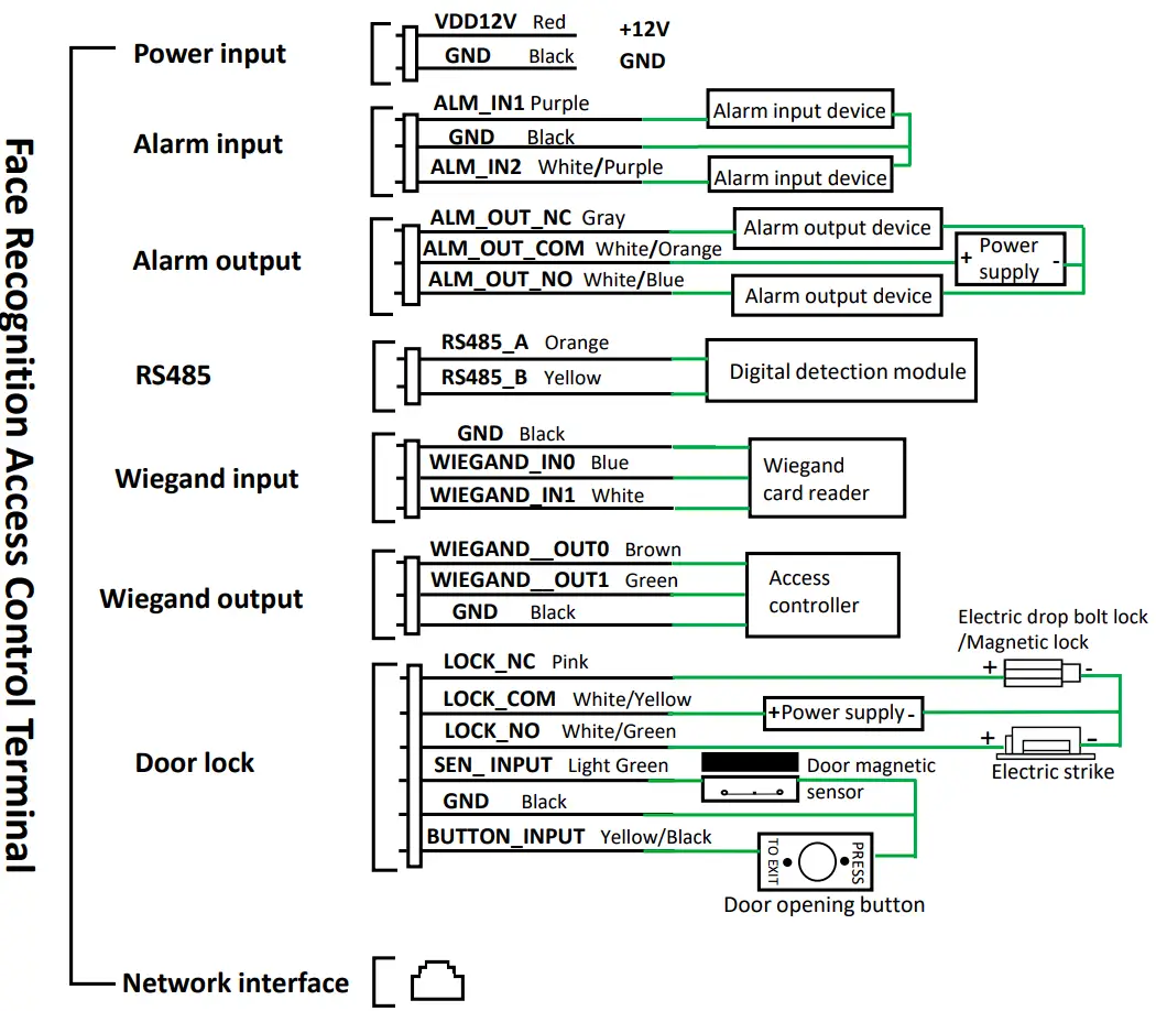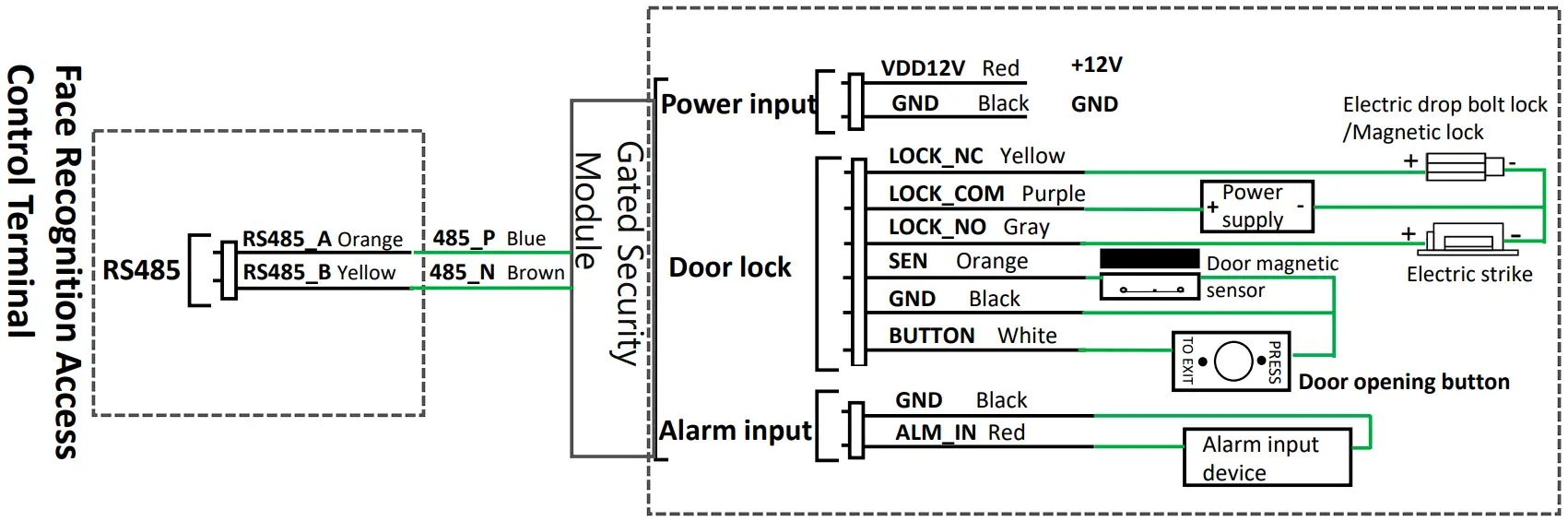 The face recognition access control terminal can be also connected to a security module. The figure below shows the wiring of the security module.